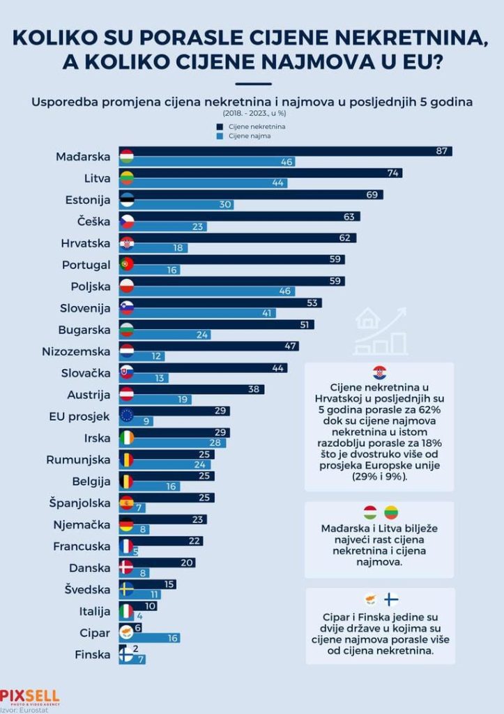 Reporteri Pixsella zato su izradili grafiku koja zorno prikazuje koliko su u pojedinim zemljama rasle cijene najma, a koliko nekretnina u pet godina od 2018. do 2023. Prema podacima Eurostata, daleko najgore je stanje u Mađarskoj i Litvi, no ni Hrvatska nije prošla znatno bolje. Vrijedi napomenuti da je europski prosjek porast cijena nekretnina od 29, te najma od 9 posto.